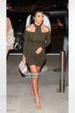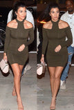 This Mini bodycon, double lined dress is a must have! This dress features a racer front and back with super sultry off the shoulder long sleeves, and a choker neckline.