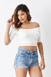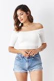 THE MYSTYLEMODE IVORY OFF THE SHOULDER 3/4 SLEEVE DOUBLE LINED CROP TOP
