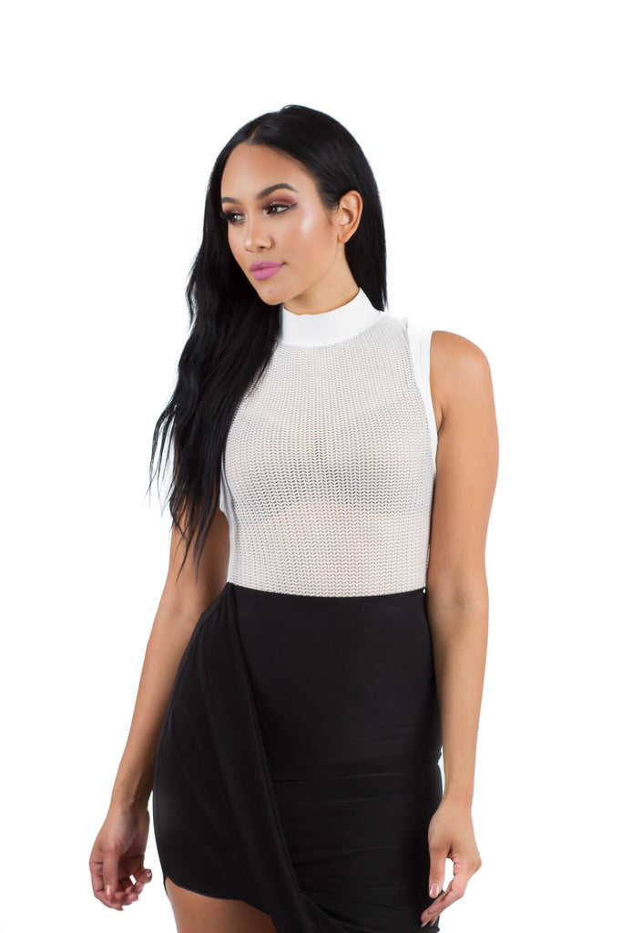 THE MYSTYLEMODE WHITE NETTED MOCK NECK SLEEVELESS BODYSUIT