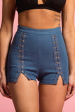 These hook and eye shorts are sure to stand out. The hook eye detail is adjustable to your level of sexy. The high waisted detail is added for your favorite touch and the back zipper adds that little bit of extra. Dress up these shorts with heels or down with your favorite pair of sneakers.