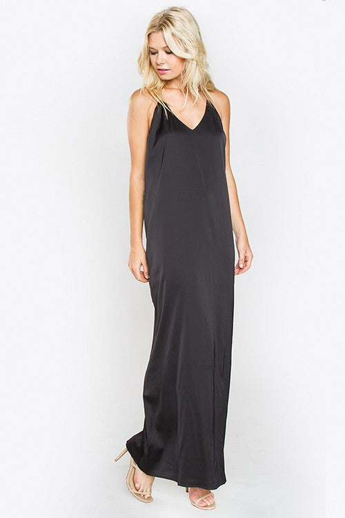This sultry, satin Maxi slip dress is so amazing and comfortable. You will never want to take the dress off! It features a T-strap back and plunging V neck. With this dress you will be ready to take on anything effortlessly and in style.