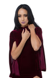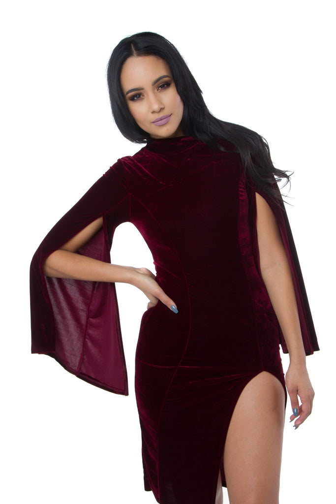 THE MYSTYLEMODE BURGUNDY VELVET HIGH NECK SIDE SLIT BELL ARMS MIDI DRESS
