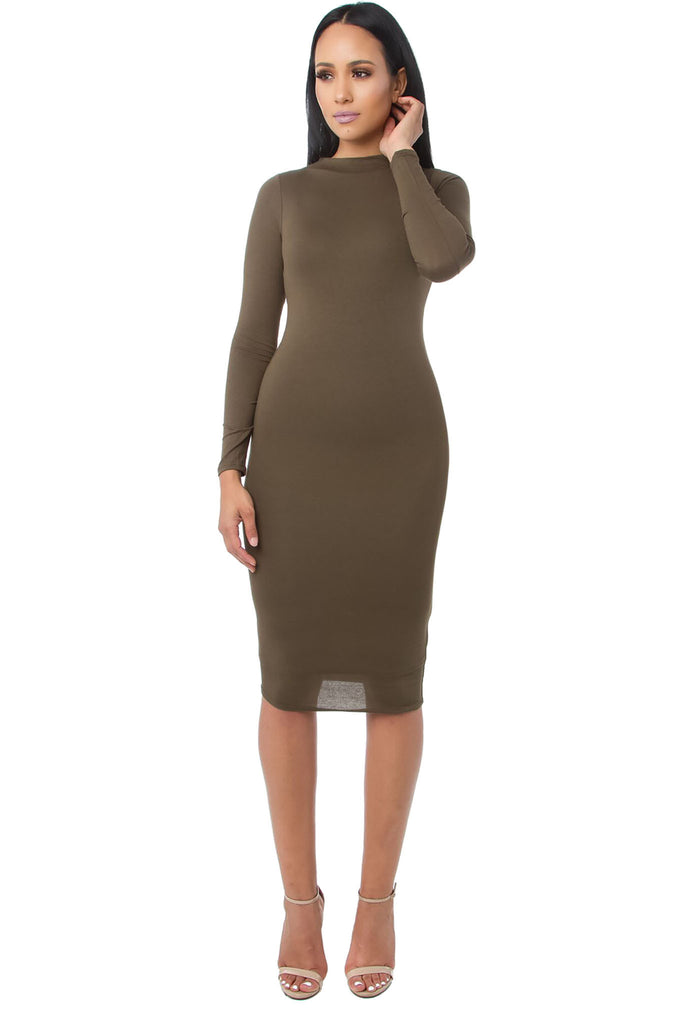 THE MYSTYLEMODE OLIVE DOUBLE LINED LONG SLEEVE FUNNEL NECK MIDI DRESS