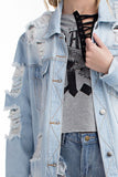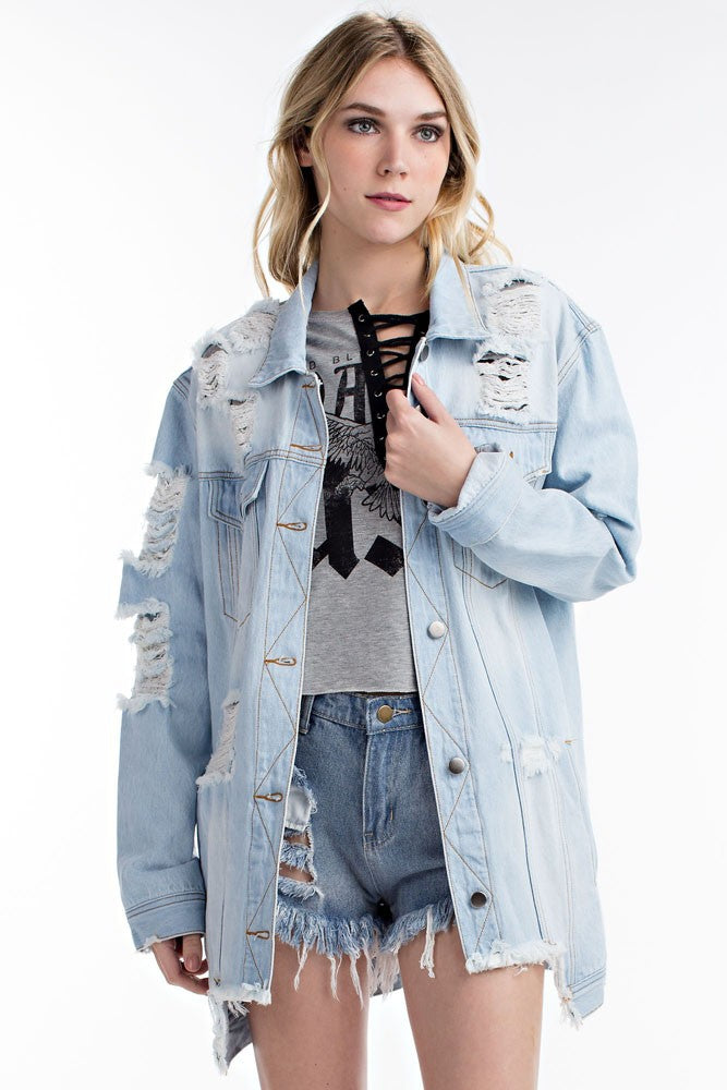 THE MYSTYLEMODE LIGHT WASH DISTRESSED DENIM OVERSIZED JEAN JACKET