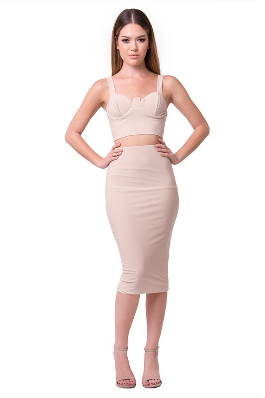 THE MYSTYLEMODE NUDE TWO PIECE FITTED BUSTIER CROP TOP AND PENCIL SKIRT SET