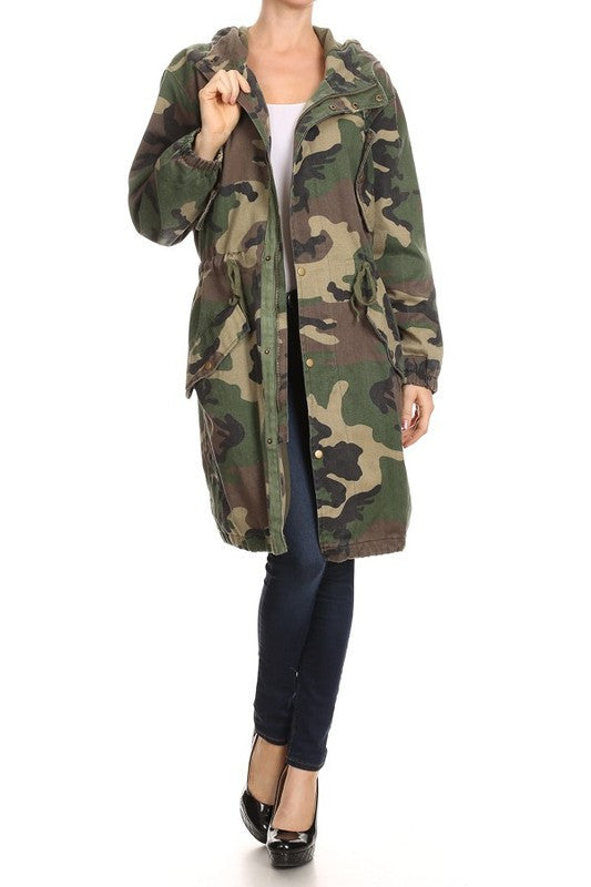 This is a one of a kind jacket that will stand the test of time! This camouflage utility jacket has a zipper and button closure, hood, long sleeves, drawstring adjustment at the waist, and a ton of pockets for added style. It is the perfect oversized jacket to add that little bit of extra to any outfit! Perfect to wear with a bodysuit or an oversized tee with one of our corset belts!