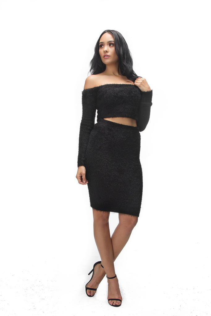 This favorite two piece set, is fun to wear, sexy, and romantic. This cute lined crop top with feather like material is sure to stand out. Perfect for your next Holiday party. You will have everyone asking where you got this unique piece from.