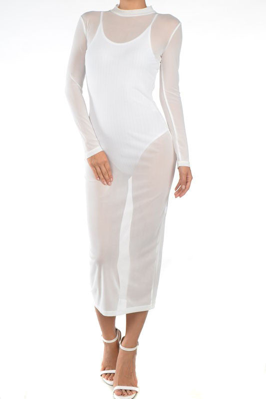 THE MYSTYLEMODE WHITE HIGH NECK ZIPPER BACK MESH DRESS