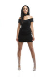 THE MYSTYLEMODE BLACK RIBBED OFF THE SHOULDER FRAYED MINI DRESS