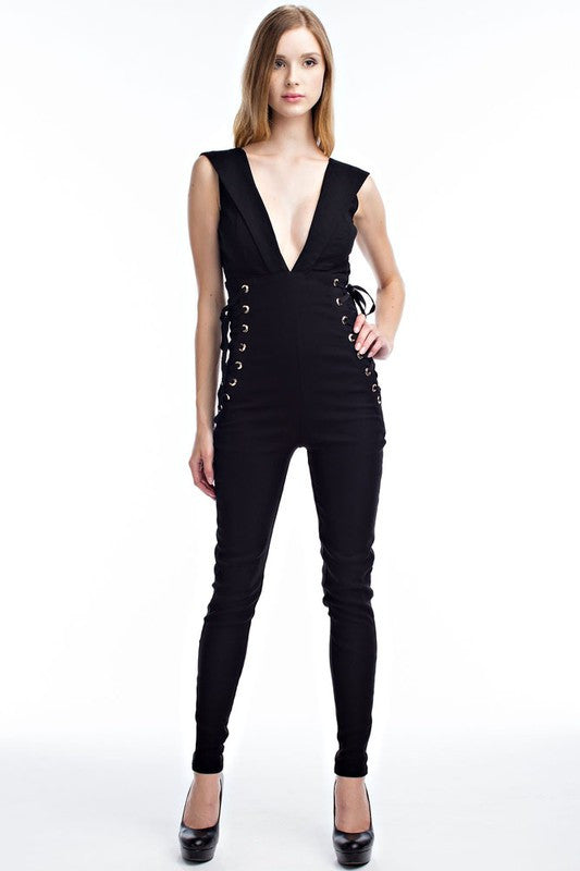THE MYSTYLEMODE BLACK WITH DEEP SIDE LACE UP JUMPSUIT
