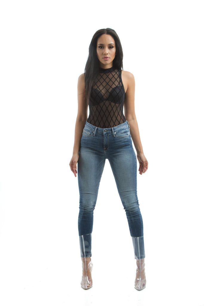 The Mystylemode diamond mesh sleeveless bodysuit is a one of a kind staple piece to add to your wardrobe. The mesh, funnel neck bodysuit is on point, but the diamond mesh design takes this bodysuit to another level. The bodysuit is perfect with jeans to look fabulous and comfortable at the same time or pair with one of our signature skirts to spice up your outfit. The bodysuit features a brief type bottom.