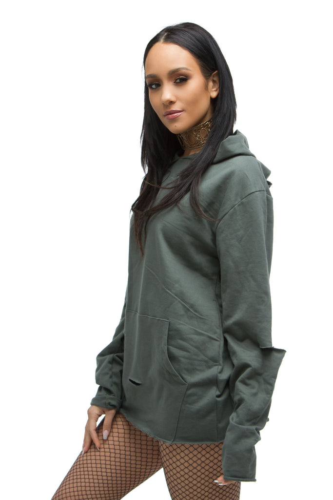 THE MYSTYLEMODE MENSWEAR OLIVE DISTRESSED HOODIE