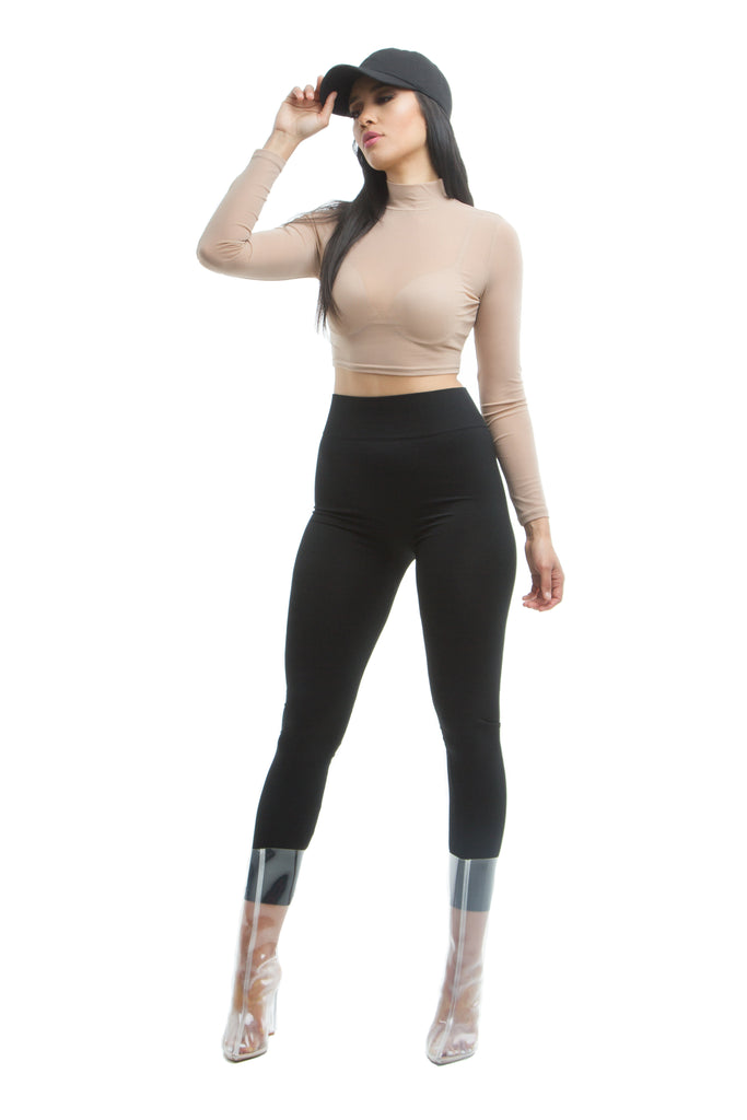 THE MYSTYLEMODE NUDE LONG SLEEVE MOCK NECK MESH CROP TOP