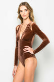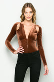 THE MYSTYLEMODE COPPER VELVET PLUNGING V NECK SHOULDER SLIT LONG SLEEVE BODYSUIT